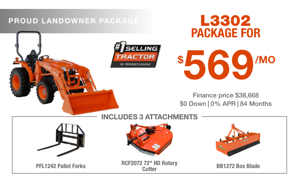 L3302 - Includes Loader, Pallet Forks, Rotary Cutter, and Box Blade